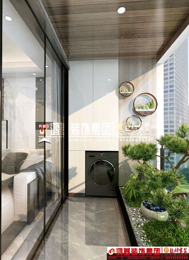 圖4.亮點:陽臺西側(cè)滾筒洗衣機和儲物柜的結(jié)合設(shè)計,充分利用空間。衛(wèi)生打掃更加方便,不留死角。 東側(cè)留有更多的空間可以培養(yǎng)綠植及休閑,給陽臺空間增添生機。